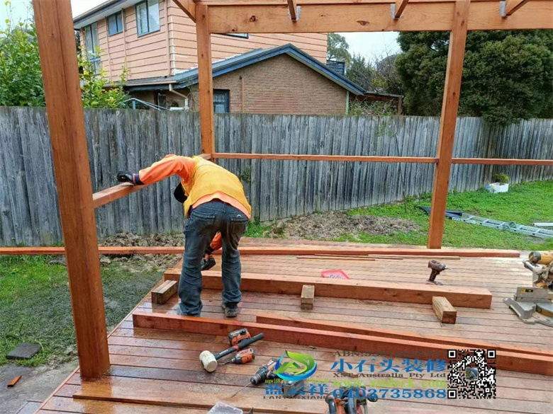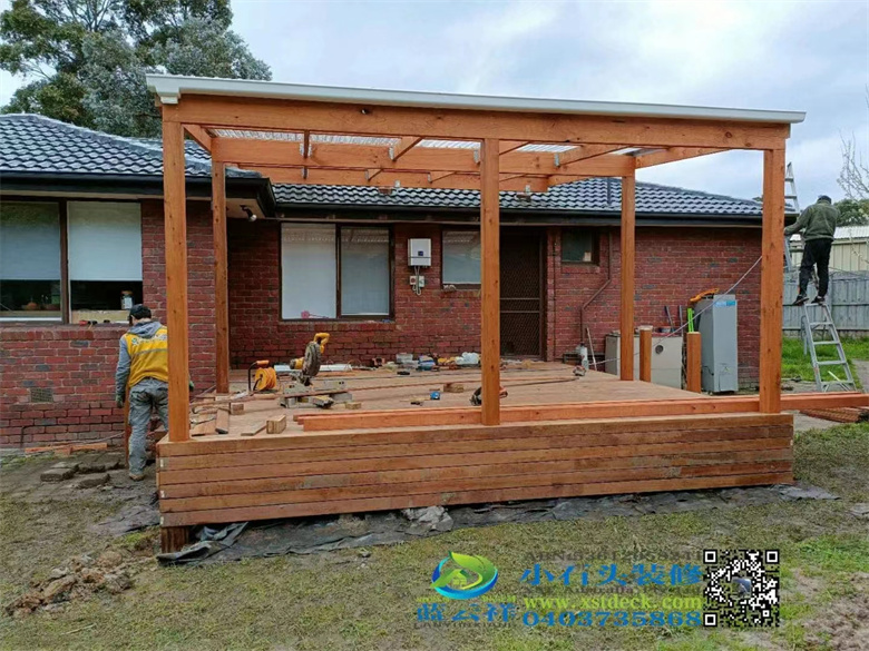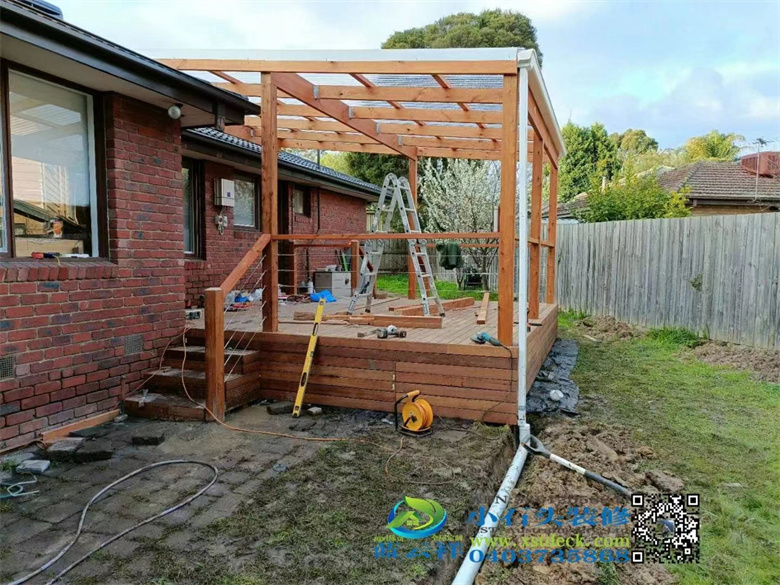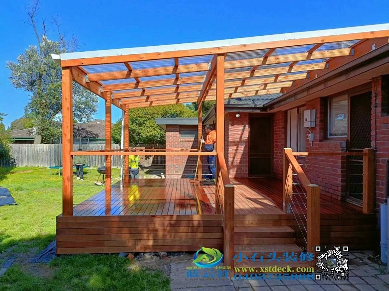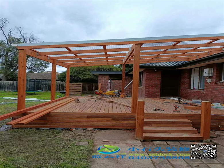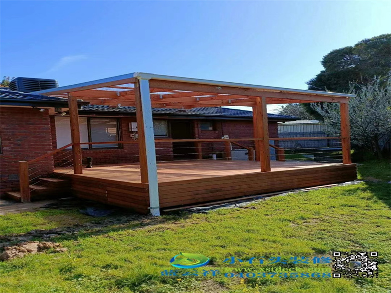 Melbourne wooden canopy, rain shelter, pergola, Roof structure, outdoor flooring, solid wood flooring, merbau 90X19, Stainless steel pull wire, modern style.