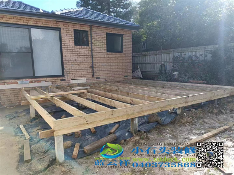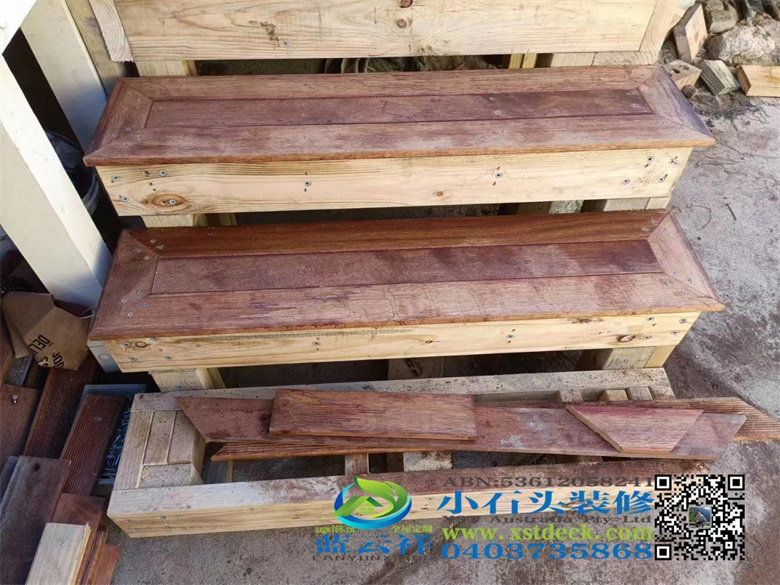 Melbourne with license 190x45 anti-corrosion treated wood bottom frame, cement top post, outdoor floor merbau 90x19 Outsourcing edge 45 degree angle, the gap between each board is treated with 4~5mm.