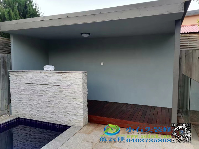 Merbau 90X19 decking on the edge of swimming pool in Melbourne, Australia, outdoor floor. Pergola pergola, ceiling wall.