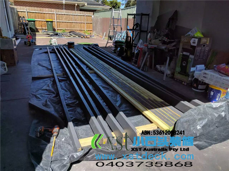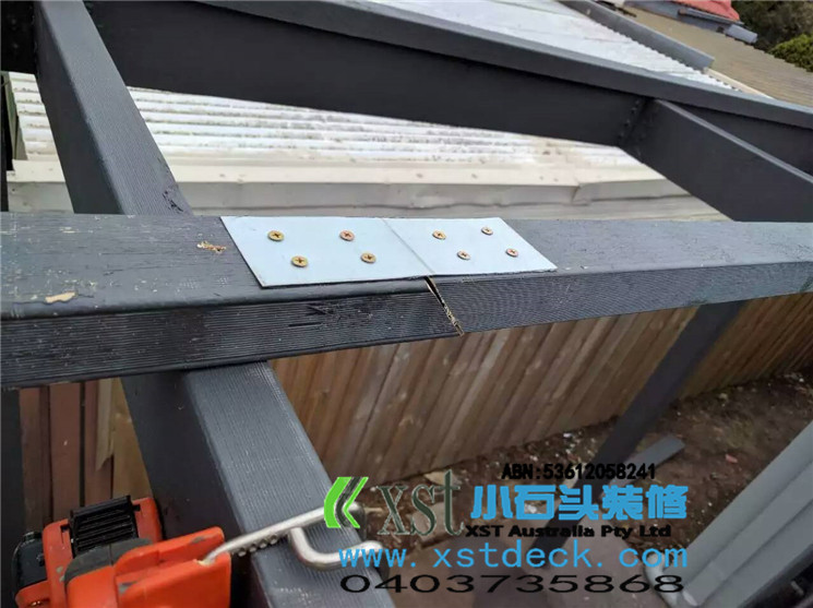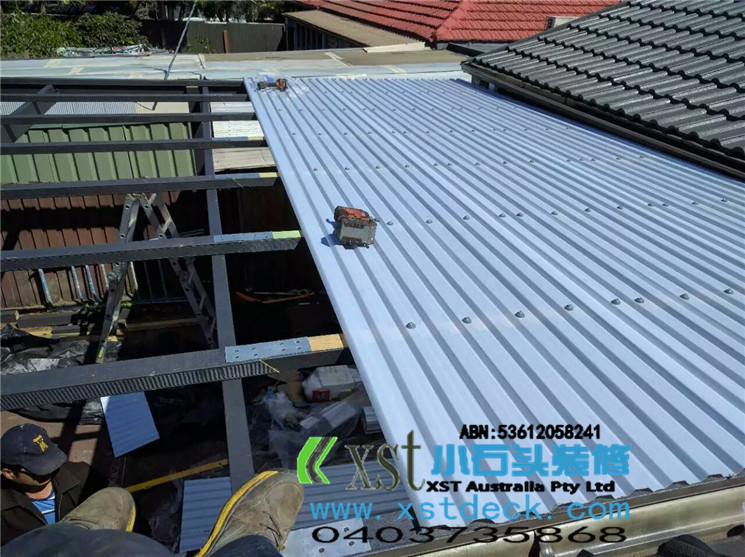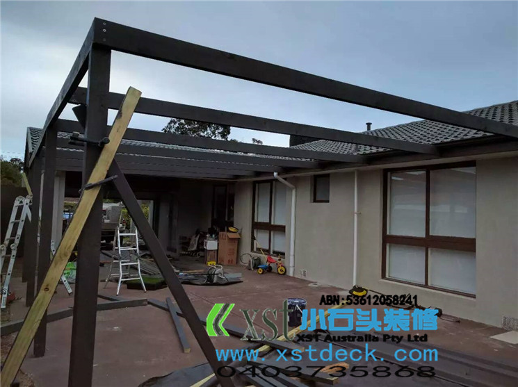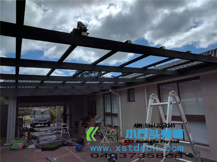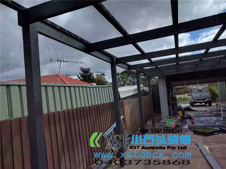 墨尔本 pergola carport 38平方5米跨度车棚。三面L型铁皮包边,防漏水,全油漆,水槽