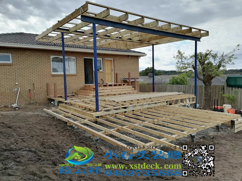 澳大利亚墨尔本户外大型凉棚 pergola,户外地板decking,玻璃围栏,拉钢丝扶手。