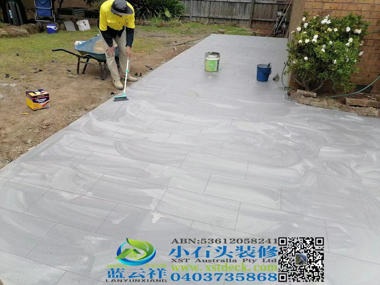澳大利亚,墨尔本,室外300X600青灰色地砖,水泥打,勾缝处理。