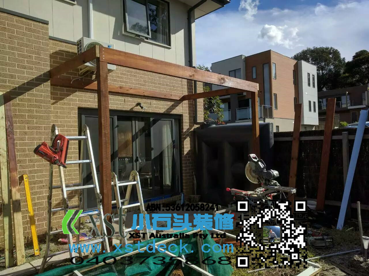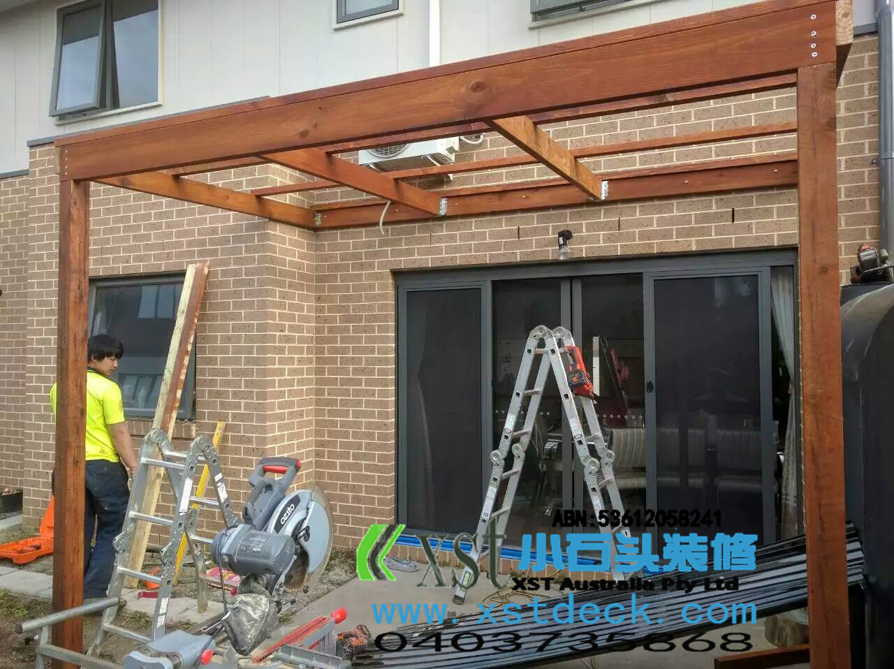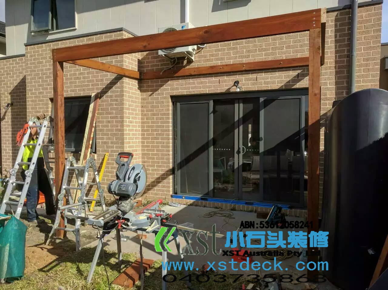 墨尔本pergola 8平方凉棚3.7米跨度,三面L型铁皮包边,防水处理,油漆保护。