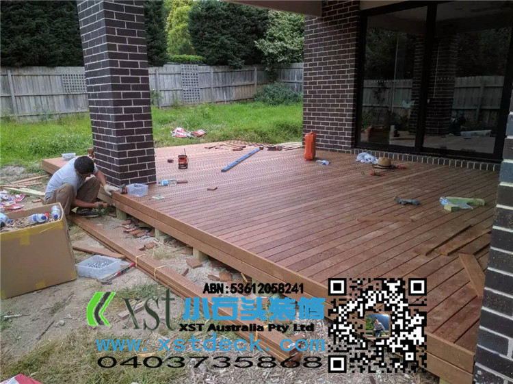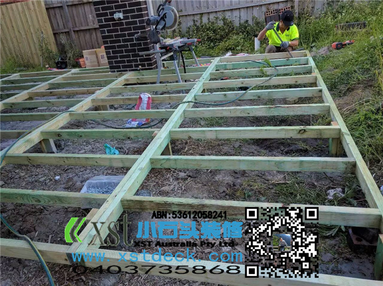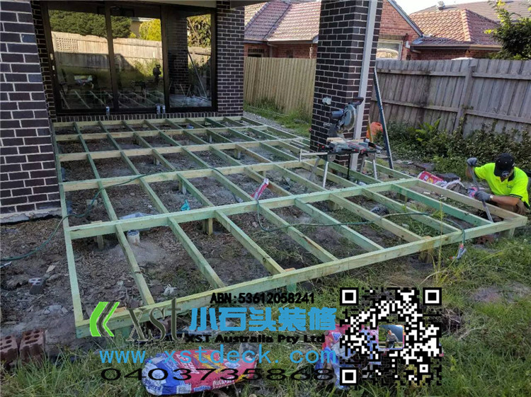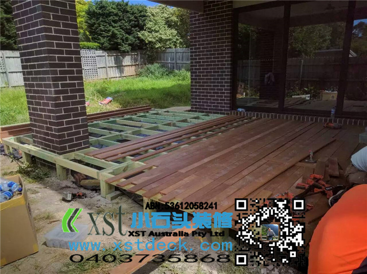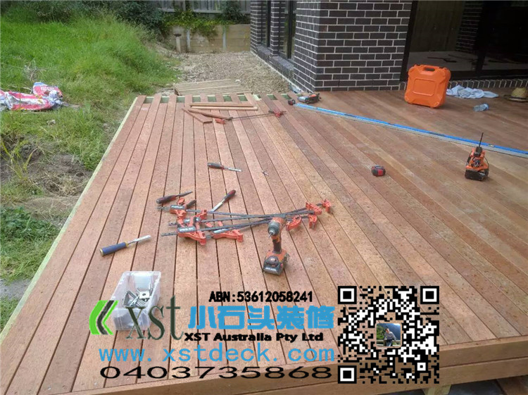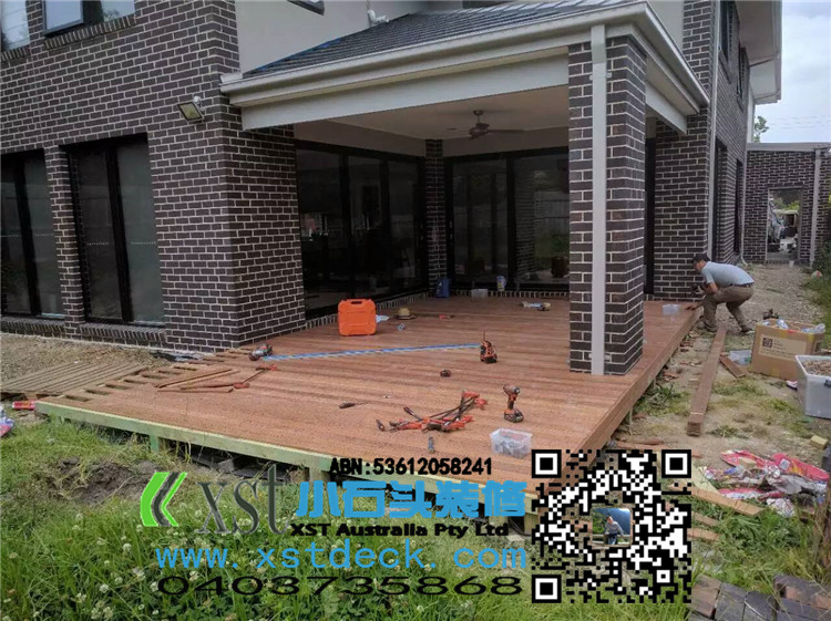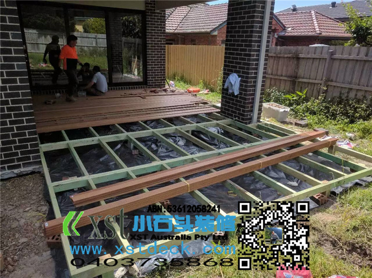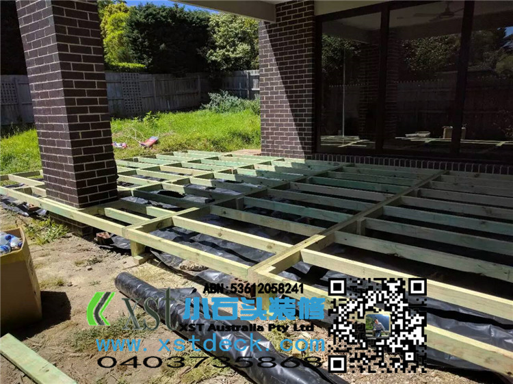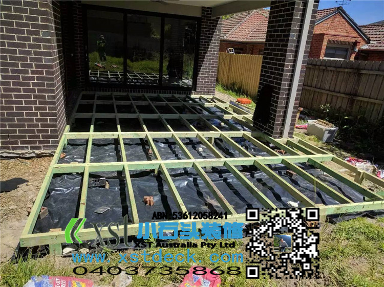 墨尔本 decking 后院36平方户外地板 防草处理 每一个板的缝隙我们还是保持5毫米。