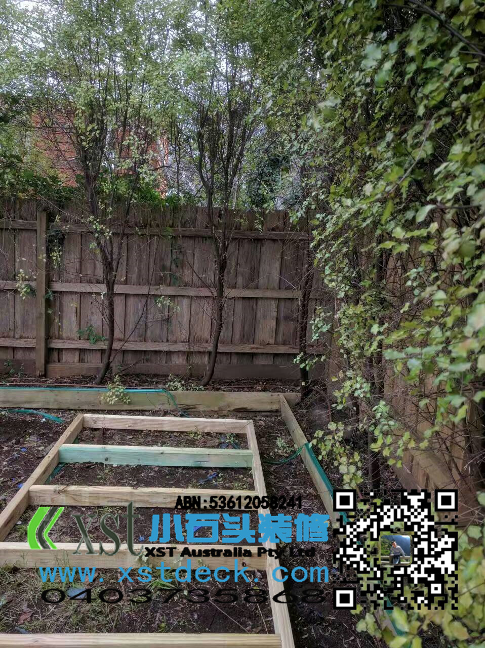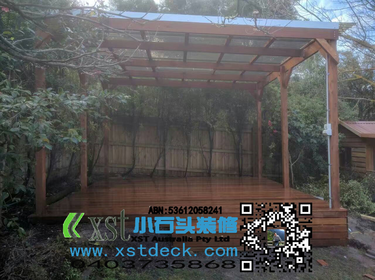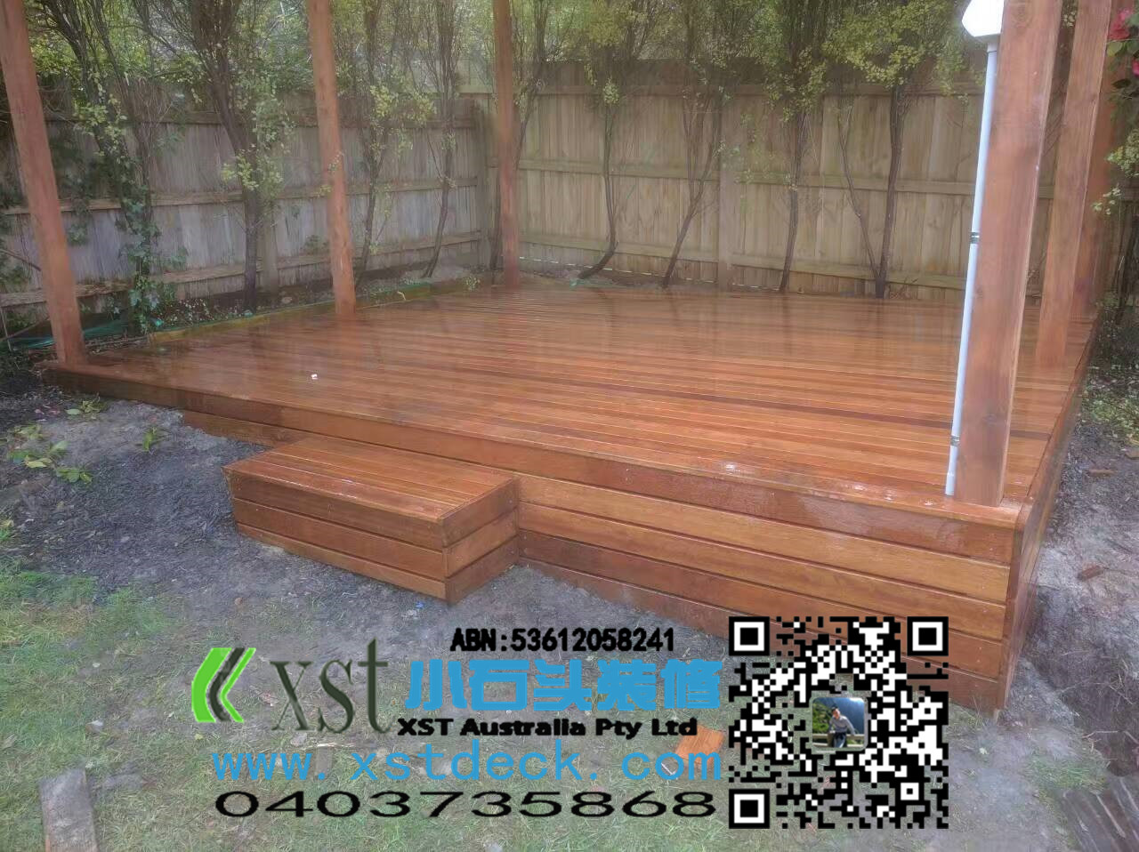 墨尔本decking18平米户外地板decking小楼梯,不锈钢螺栓,每张decking板缝隙都有专业的夹子夹出来,保证5毫米左右。
