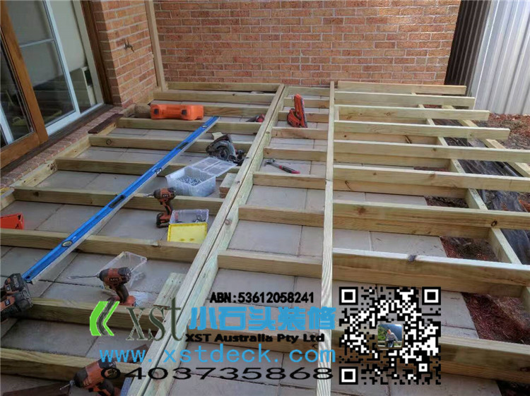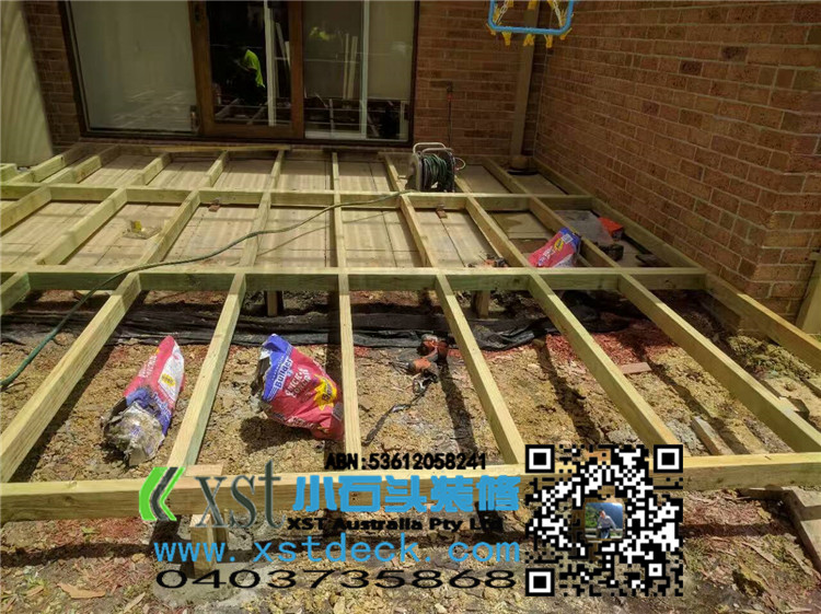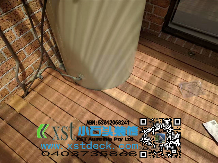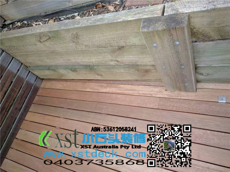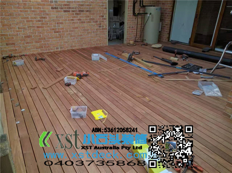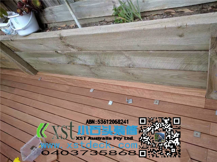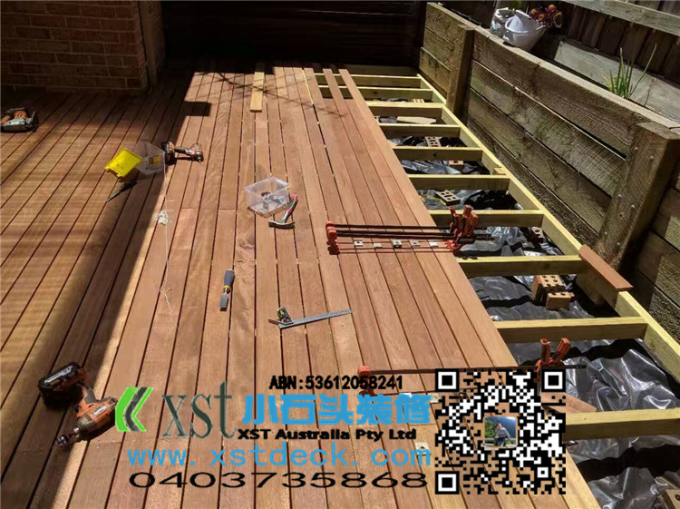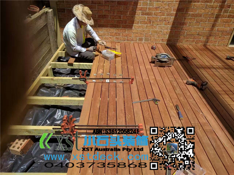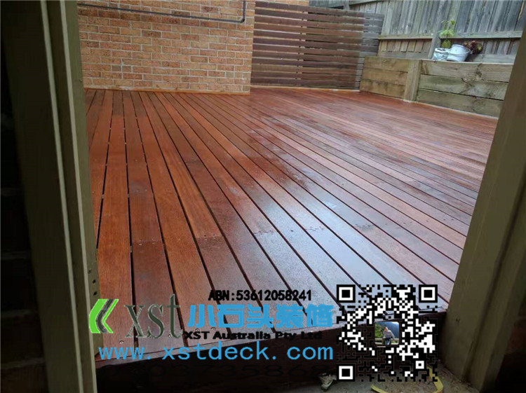 墨尔本 decking 35平方户外地板 每张decking板缝我们还是保持5毫米,每个收边,我们尽量到位,做防草处理,刷decking保油