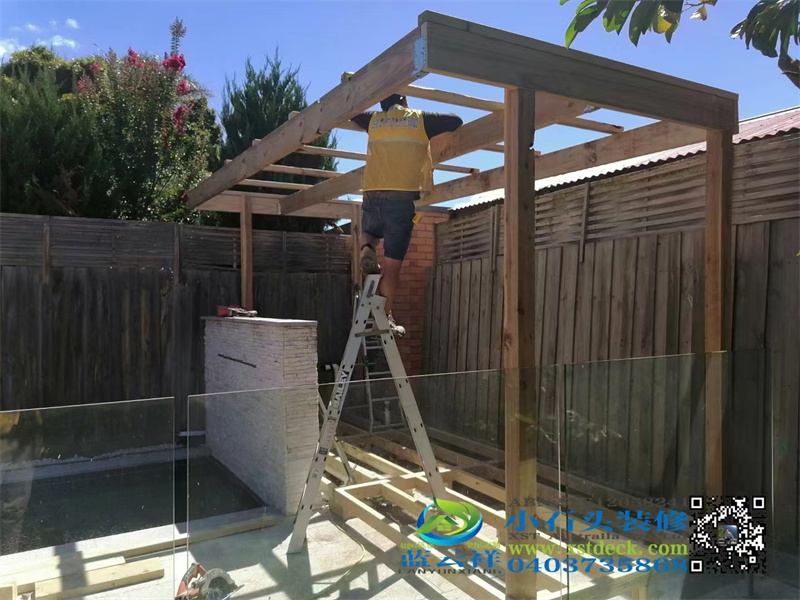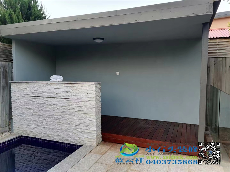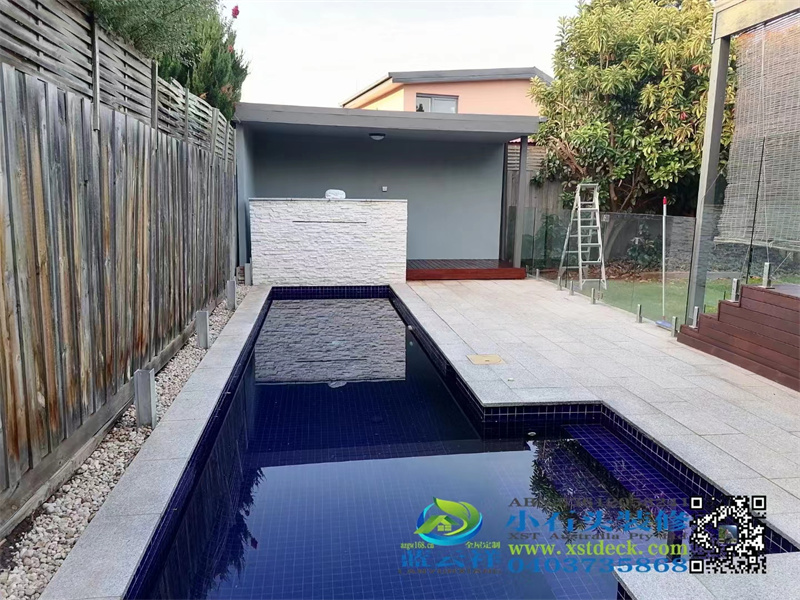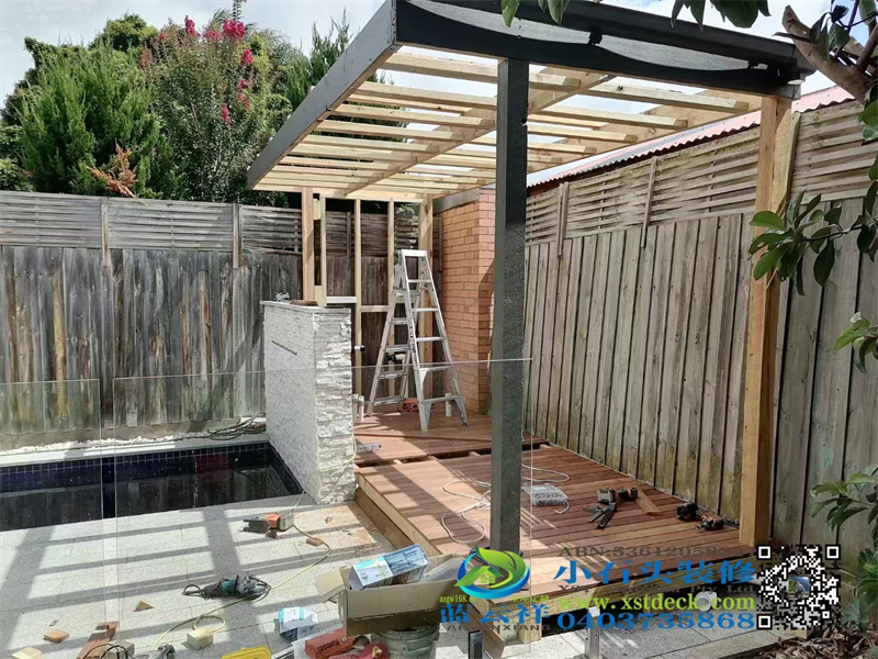澳大利亚墨尔本游泳池边上merbau 90X19 decking,户外地板。凉棚pergola,吊顶封墙