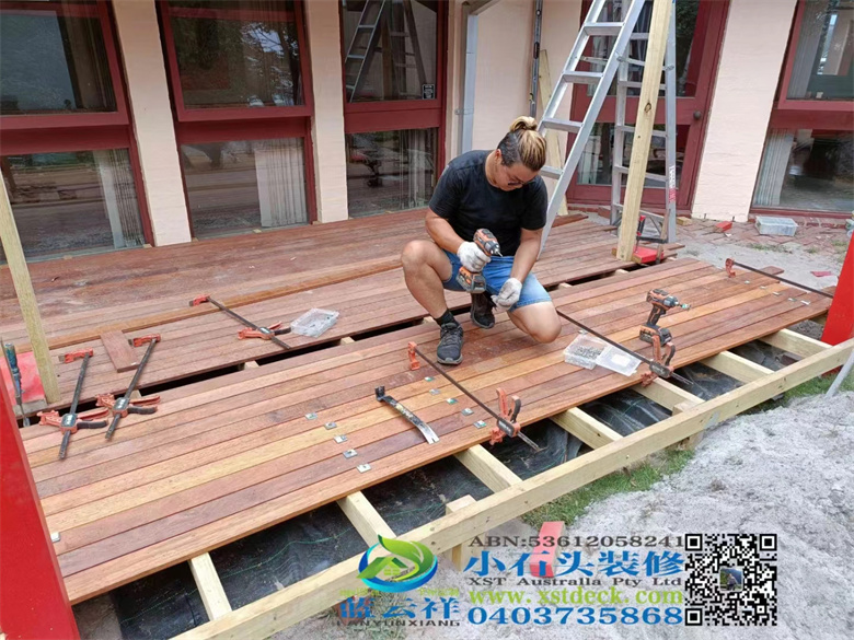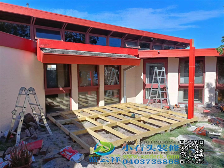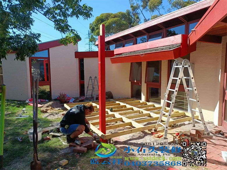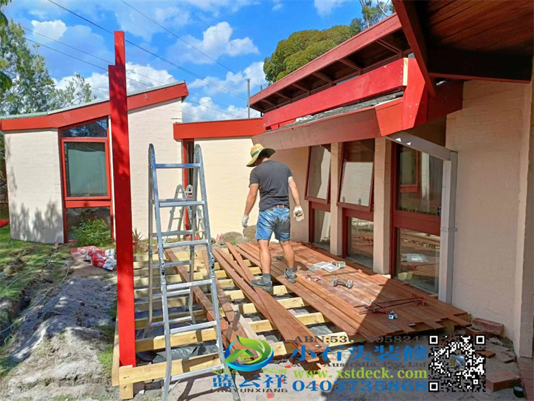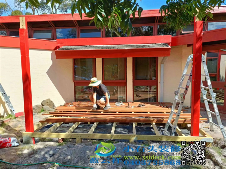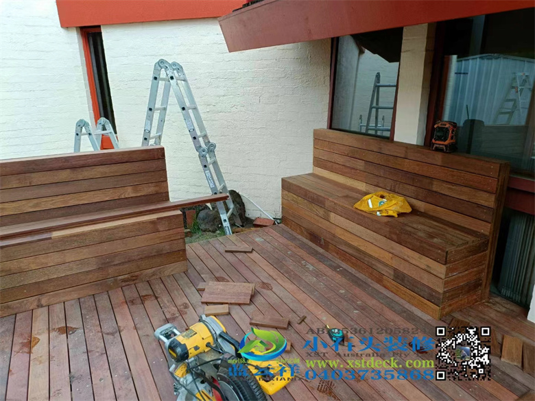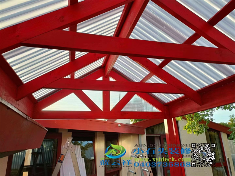 墨尔本户外人字顶凉棚,雨棚pergola,户外菠萝格实木地板 ,merbau decking 90x19,户外定制带靠背凳子 ,纱布防雨帘。