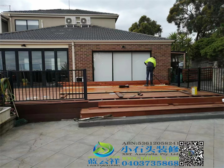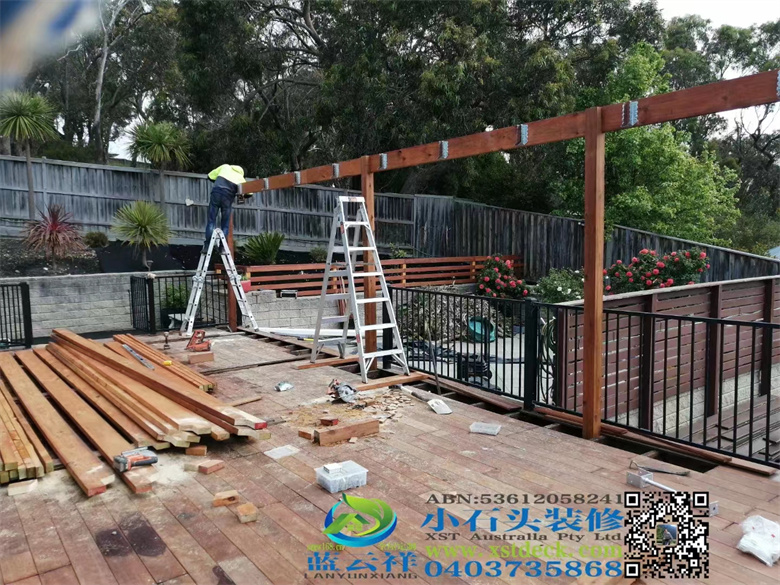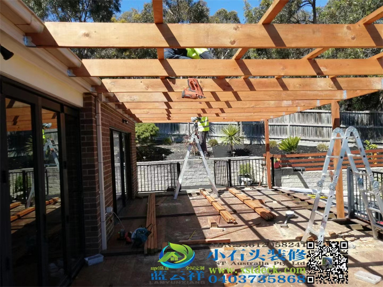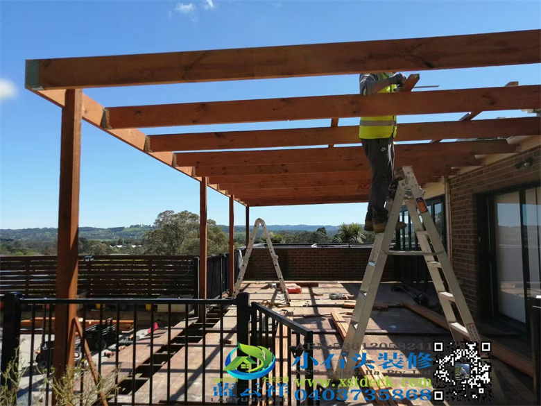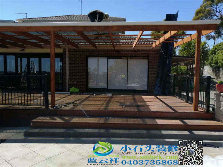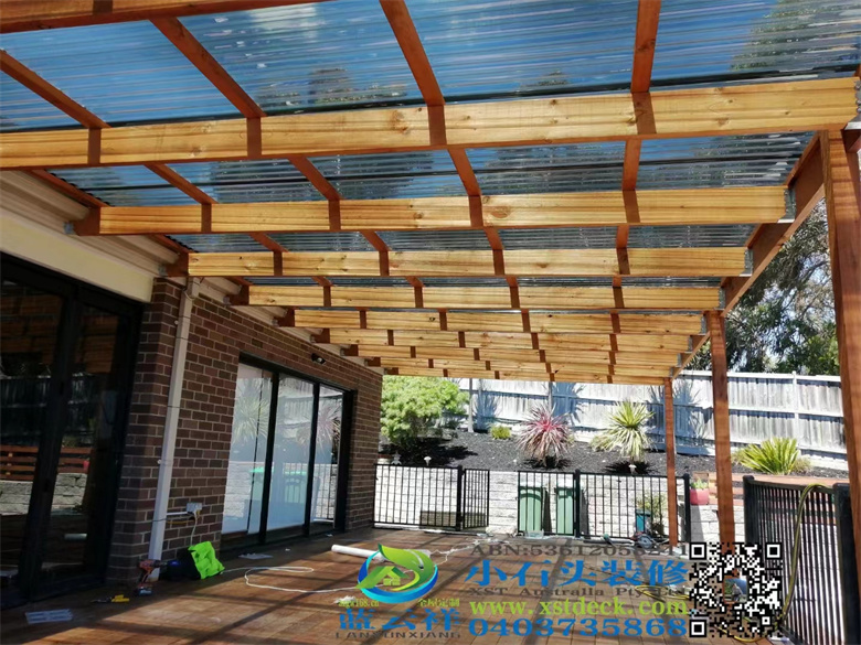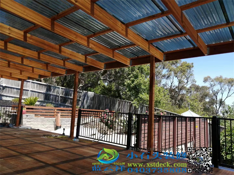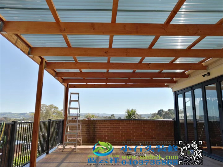墨尔本凉棚,雨棚 平顶结构pergola,棕红色清漆,青黑塑料顶棚