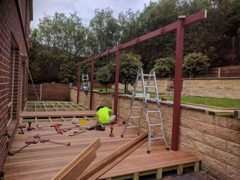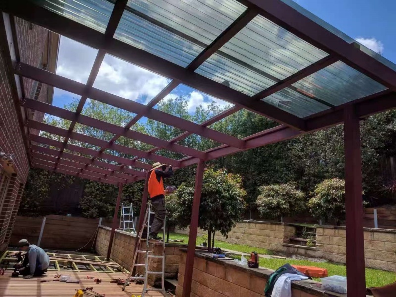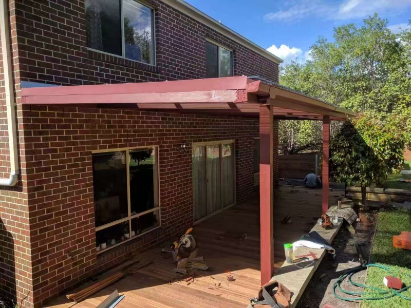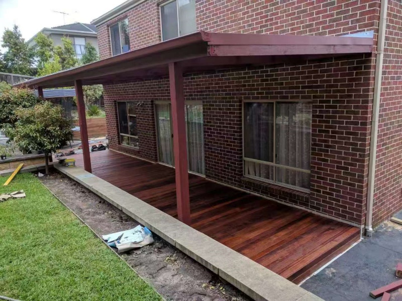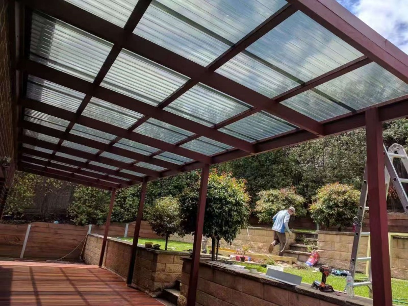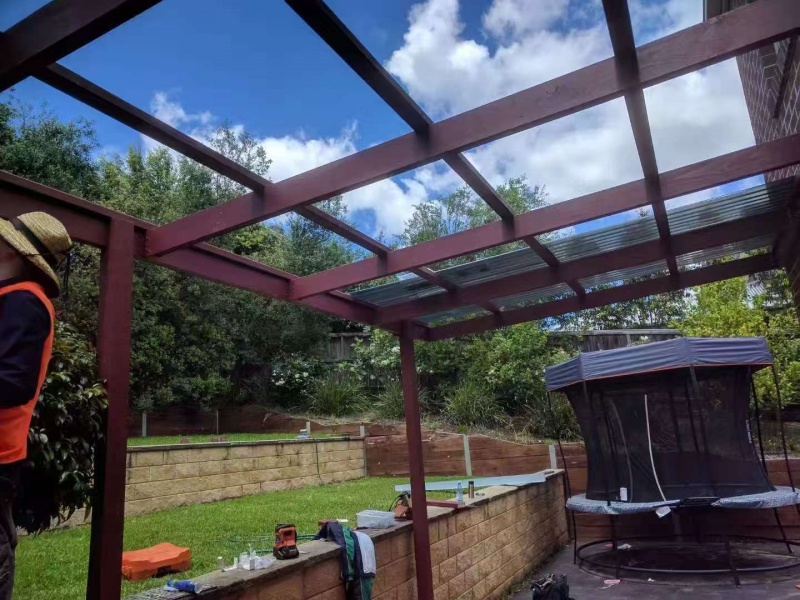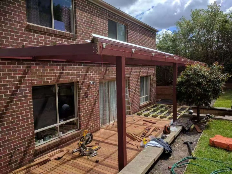 Melbourne outdoor canopy with 10.8m3.4pergola three sided L-shaped iron plate, leak proof treated with reddish brown paint.